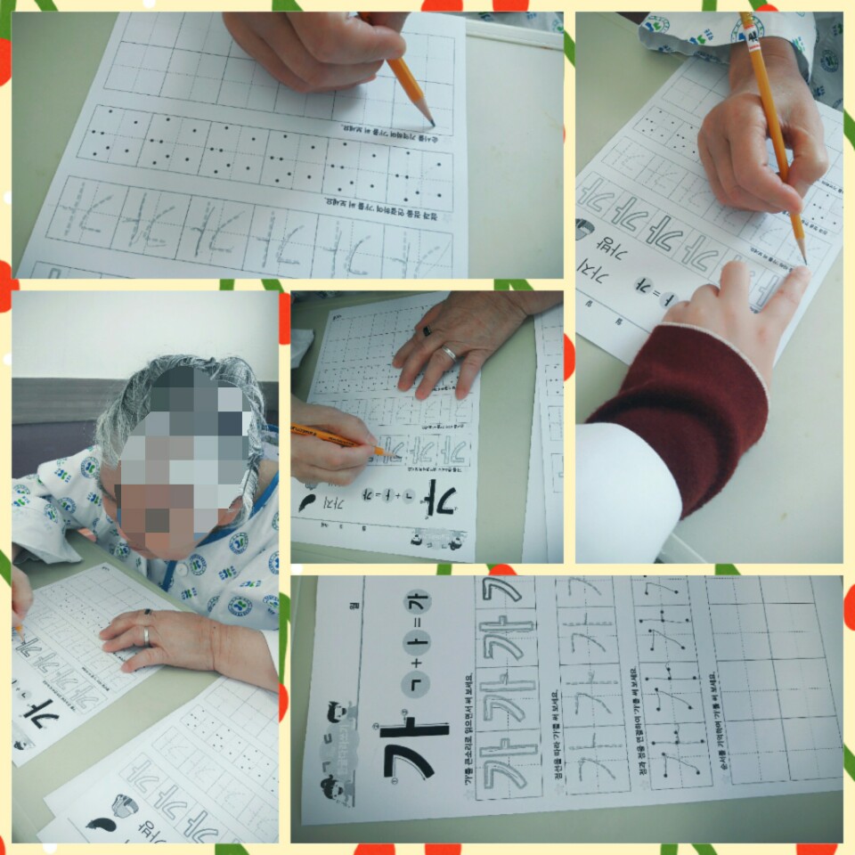 인지프로그램으로 연필을 이용하여 한글따라쓰기를 하였습니다.